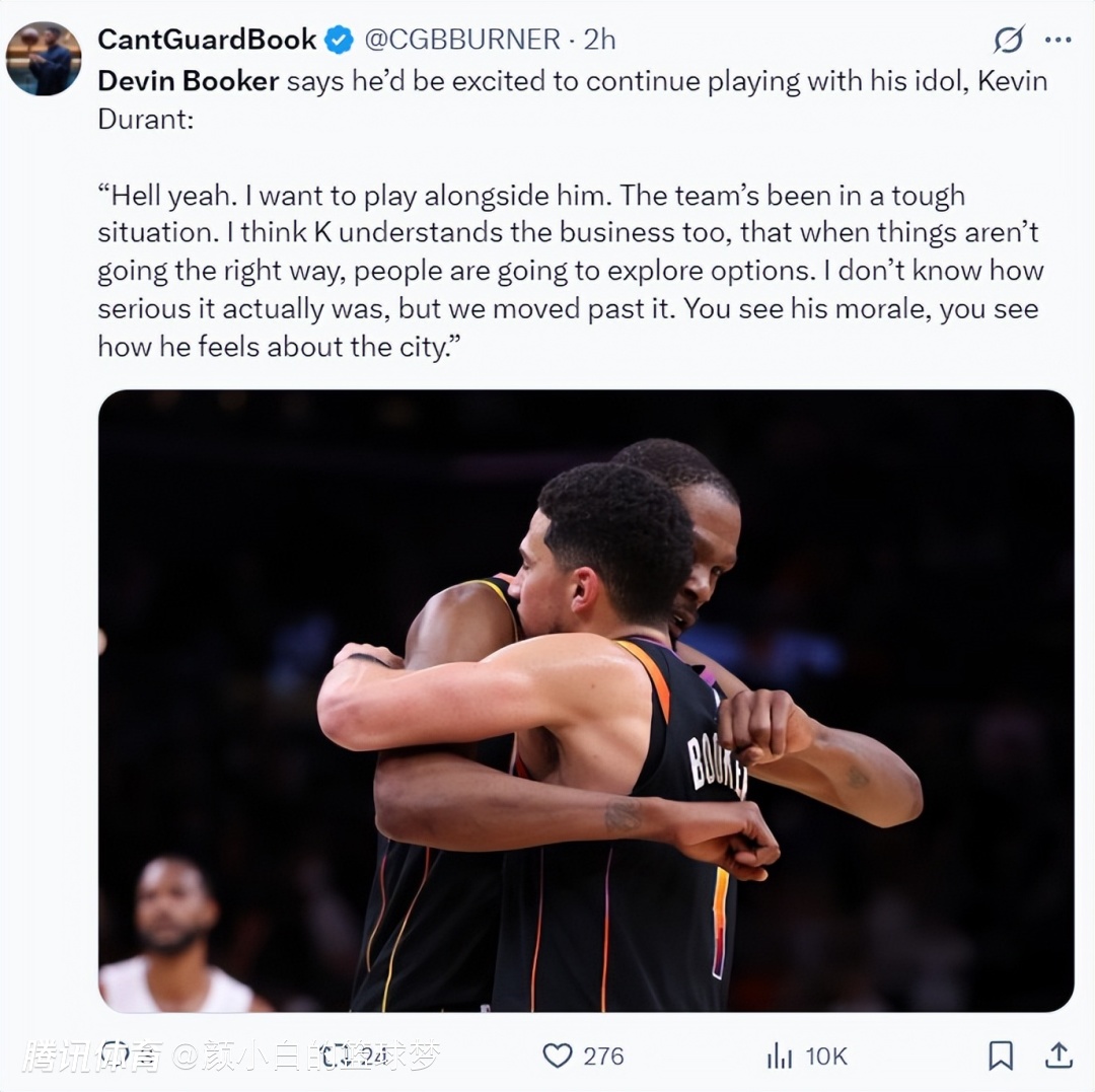 赛前布克谈到与杜兰特的合作:如果能继续与偶像KD一起打球会非常兴奋,自己很希望能继续跟KD合作,KD也明白这一点,虽然有可能现在进展不太顺利,人们会去选择其他。但我们已经克服了外界的干扰,他对这座城市已经有了感情。