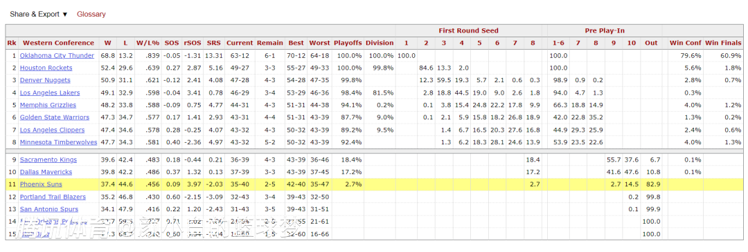此役后太阳遭遇四连败,根据数据网站的预测太阳进入附加赛的概率只剩17.2%,进入季后赛的概率只剩2.7%,无缘附加赛的概率82.9%。
