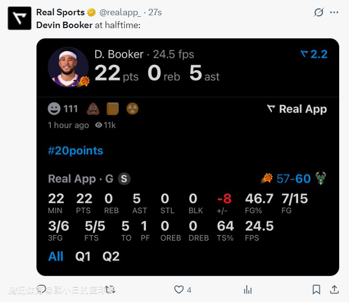 次节太阳一度被拉开到12分,可第二阵容没有放弃疯狂追分,布克登场后太阳甚至一度反超,布克单节7中4+三分4中2+罚球5中5拿到15分3助攻,半场布克已经拿到22分5助攻,真实命中率64%。