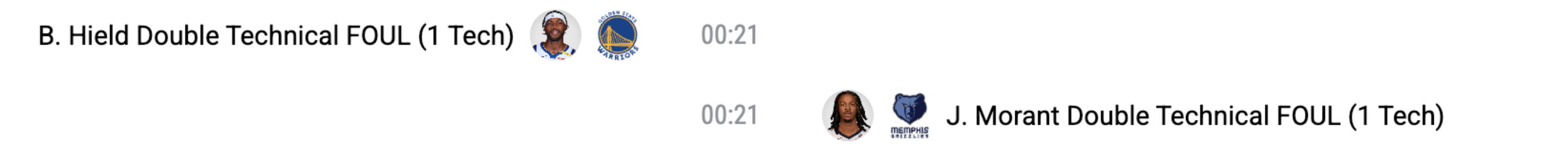 比赛末节还剩下21秒的时候,双方暂停期间,莫兰特朝勇士替补席比了一个“掏枪”动作,随后希尔德也同样模仿莫兰特的这个动作,和他“对射”,之后追梦朝着裁判理论,也模仿了这个掏枪动作,裁判最后吹罚希尔德和莫兰特两人技术犯规。