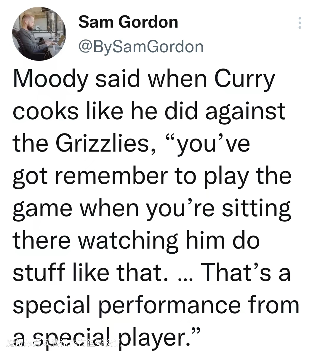 库里本场轰下52分12三分。穆迪谈到库里本场的出色表现时说道:“当你坐在场边看着他做出那样的表现时,你得记得自己是在打球。那是一位特别的球员带来的特别的表现。”