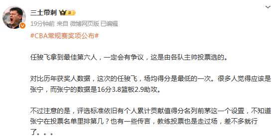 根据媒体人三土带刺发文点评:任骏飞拿到最佳第六人,一定会有争议,这是由各队主帅投票选的。
