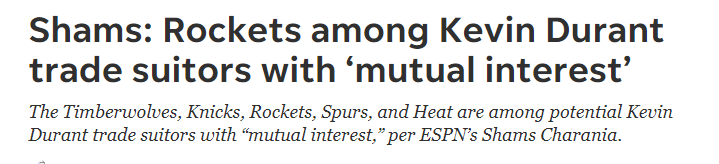 Shams表示,至少有5支球队和杜兰特在交易截止日时是互有兴趣的。“我可以跟大家透露,在NBA交易截止日时,有一批球队和杜兰特双方互有兴趣。