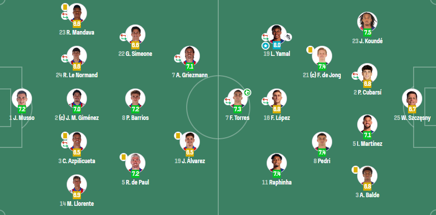 马德里竞技(5-3-2):穆索;马科斯-略伦特,阿斯皮利奎塔(46'加兰),希门内斯,勒诺尔芒(58'莫利纳),雷尼尔多(46'索尔洛特);德保罗,巴里奥斯,小西蒙尼(46'朗格莱);阿尔瓦雷斯,格列兹曼(81'里克尔梅)