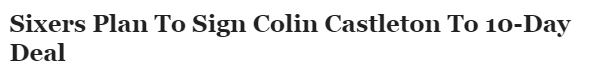 这位中锋在上述两支球队中出场时间都不多,但上个月他与多伦多猛龙队签了两份10天短合同,获得了进入轮换阵容的机会。在为猛龙队出战的10场比赛中,他场均出战25.9分钟,能得到6.9分、7.4个篮板和1.8次助攻。 除了在灰熊队和猛龙队的这段时间外,卡斯尔顿本赛季的大部分时间都在G联盟为魔术队的附属球队效力。在17场常规赛中,他场均能得到17.4分、10.6个篮板和2.8次助攻。 76人队目前的常规阵容已经满员,达到15名球员。但由于本赛季后期多名球员受伤,球队获得了一系列的困难特例。