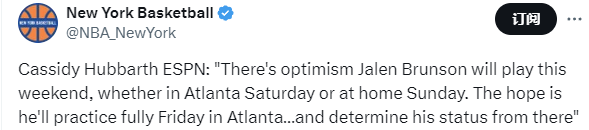 2025-04-03 08:10北京时间4月3日,根据NBA记者Cassidy Hubbarth报道,尼克斯球员杰伦-布伦森有望在本周末复出。