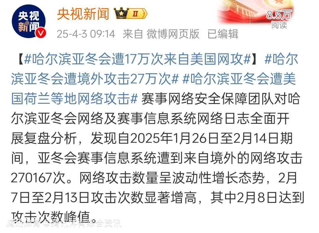 2025-04-03 09:50北京时间4月3日,根据央视总台记者张岗的报道,赛事网络安全保障团队对哈尔滨亚冬会网络及赛事信息系统网络日志全面开展复盘分析,发现自2025年1月26日至2月14日期间,亚冬会赛事信息系统遭到来自境外的网络攻击270167次。网络攻击数量呈波动性增长态势,2月7日至2月13日攻击次数显著增高,其中2月8日达到攻击次数峰值。