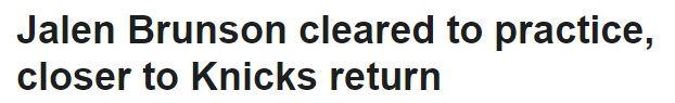 尼克斯利好!布伦森将归队训练 有望在本周末比赛中复出