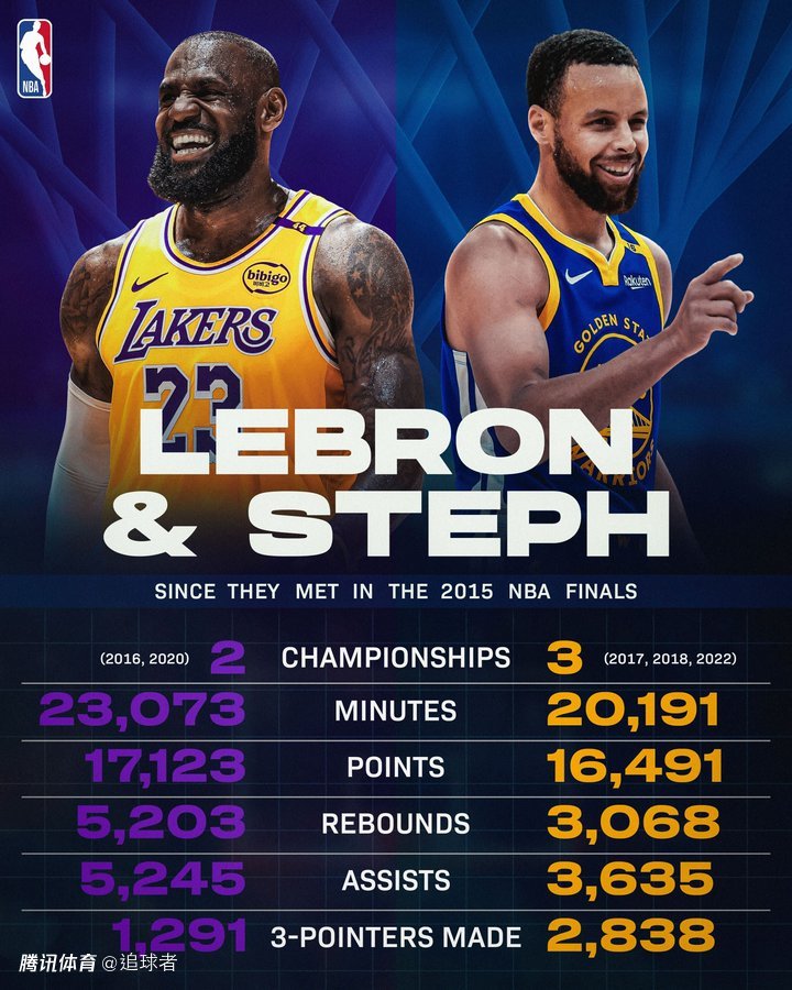 NBA官方连续为湖勇大战预热,晒詹姆斯和库里在2015年总决赛交手之后,最近10年詹姆斯出战23073分钟,拿到17123分5203篮板5245助攻和命中1291记三分,两次夺得总冠军;库里则是出战20191分钟,拿到16491分3068篮板3635助攻和命中2838记三分,三次夺得总冠军。
