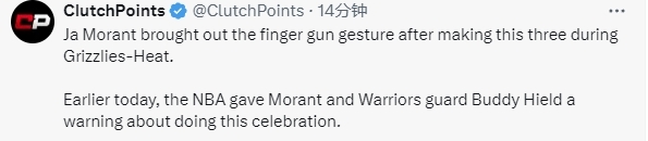 值得一提的是,NBA官方此前就曾对莫兰特和希尔德在比赛中做出比枪手势一事进行了调查,而昨日他们已经向勇士队、灰熊队以及两位运动员发出了警告,但不会做进一步处罚。联盟裁定,这些庆祝动作并非有意暴力,但不合适,应予以制止。
