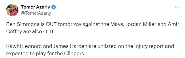 快船队方面,本-西蒙斯、乔丹・米勒和科菲将缺席比赛。莱昂纳德和詹姆斯-哈登不在伤病报告中,预计会代表洛杉矶快船队出战。