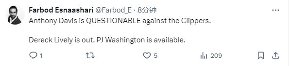独行侠队方面,安东尼-戴维斯出战成疑,莱夫利二世缺席比赛,PJ-华盛顿可以出战。