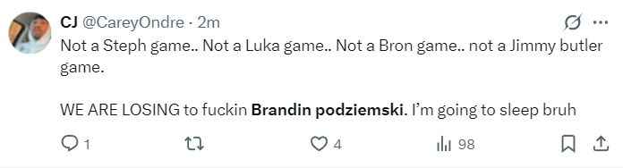 勇士球迷:这不是斯蒂芬的比赛……这不是卢卡的比赛……这不是勒布朗的比赛……也不是吉米-巴特勒的比赛。我们输给了该死的波杰姆斯基。我要去睡觉了,兄弟。
