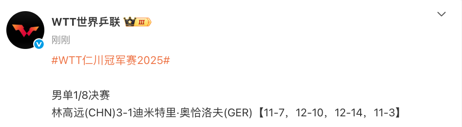 2025-04-04 15:50北京时间4月4日,WTT仁川冠军赛男单1/8决赛,林高远3-1奥恰洛夫,晋级八强。