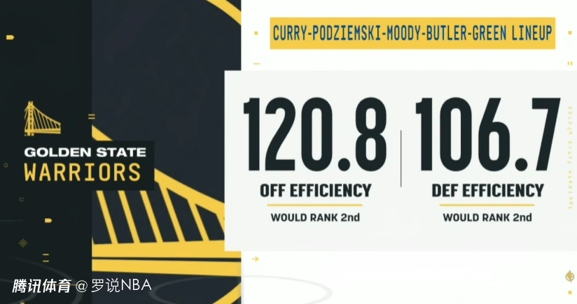 数据显示,这套阵容在场时进攻效率120.8,相当于联盟第2的水准(仅次于骑士的121.6),而防守效率是106.7,同样相当于联盟第2的水准(仅次于雷霆的105.9)