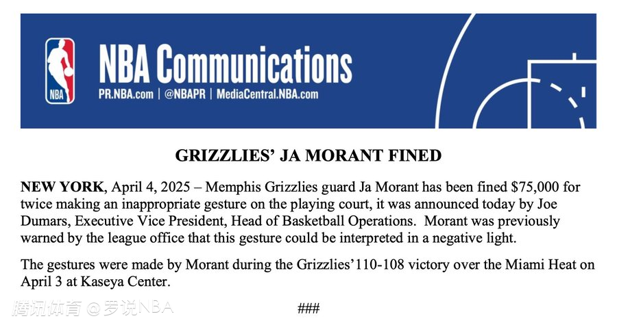 NBA宣布罚款7.5万美元!莫兰特屡教不改?直言喜欢扮演反派角色