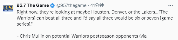 穆林随后还展望了季后赛可能出现的对决,他说道:“目前,他们考虑的对手可能是火箭队、掘金队或者洛杉矶湖人队……(金州勇士队)能战胜这三支球队中的任何一支,而且我认为和这三支球队中的任何一支交锋,系列赛都会打到第六场或者第七场。”