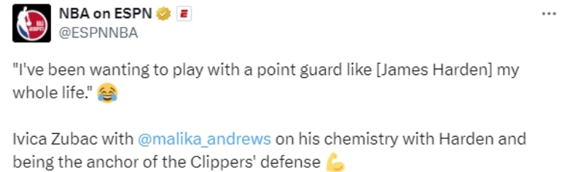 祖巴茨表示:“自从哈登来到快船队之后,他就让我变得更自信,我们能通过挡拆完成配合,我这辈子一直都渴望能和像詹姆斯-哈登这样的控球后卫一起打球。我认为他是有史以来打挡拆最好的球员,即使不是最好的,也是最好的之一,和他一起打球相当轻松。”