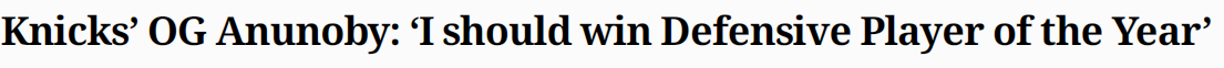 阿奴诺比在上个休赛期签下了一份为期五年、价值2.125亿美元的合同。在布伦森因脚踝扭伤缺阵期间,他在进攻端挺身而出,但防守依旧是阿努诺比的标志性能力,也是他的骄傲之源。 阿奴诺比在谈到能否获得最佳防守一阵的荣誉时说道:“这对我来说非常重要。这关乎努力,就是要努力打球,帮助球队赢球,这很重要。”