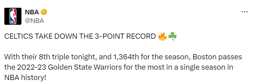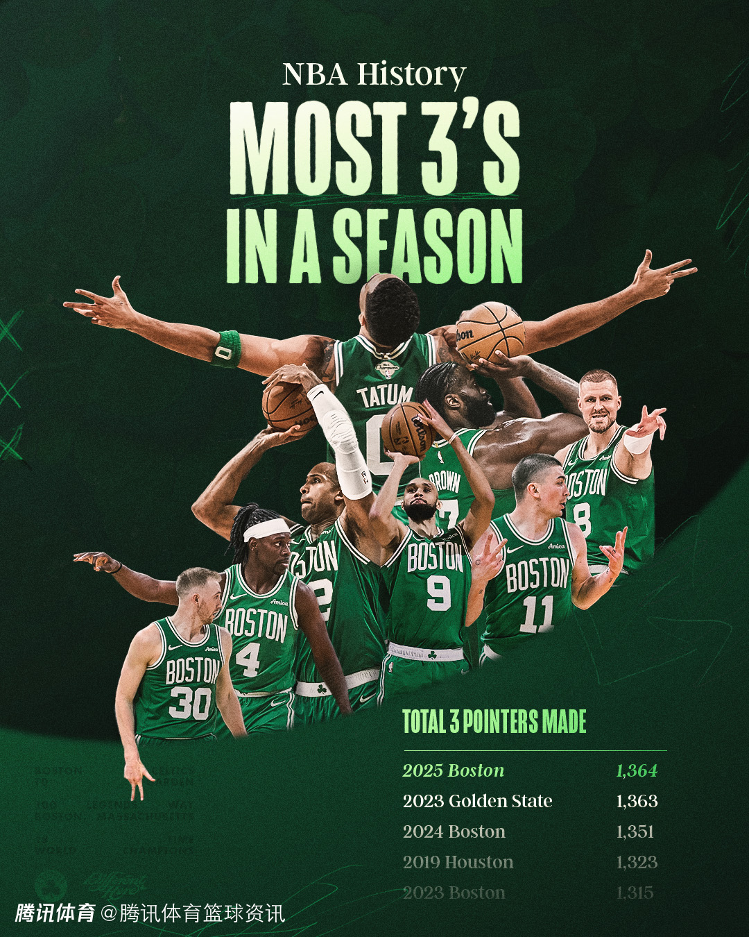 新纪录诞生!凯尔特人单赛季投中1364个三分球 超越23勇士升历史第一