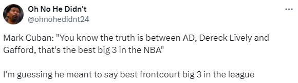 库班说道:“你知道,事实上,就安东尼-戴维斯、莱夫利和加福德而言,他们是NBA最出色的内线三巨头。”