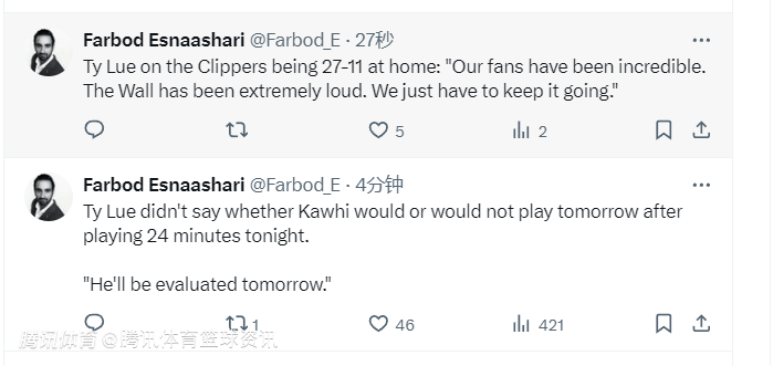 泰伦-卢暂时无法确定莱昂纳德在今晚出战24分钟后,明天是否会登场比赛。他表示:“明天会对他的情况进行评估。”本场比赛中,莱昂纳德出战24分钟,全场17投8中,其中三分球5投2中,罚球2投2中,得到20分6篮板2助攻1抢断。