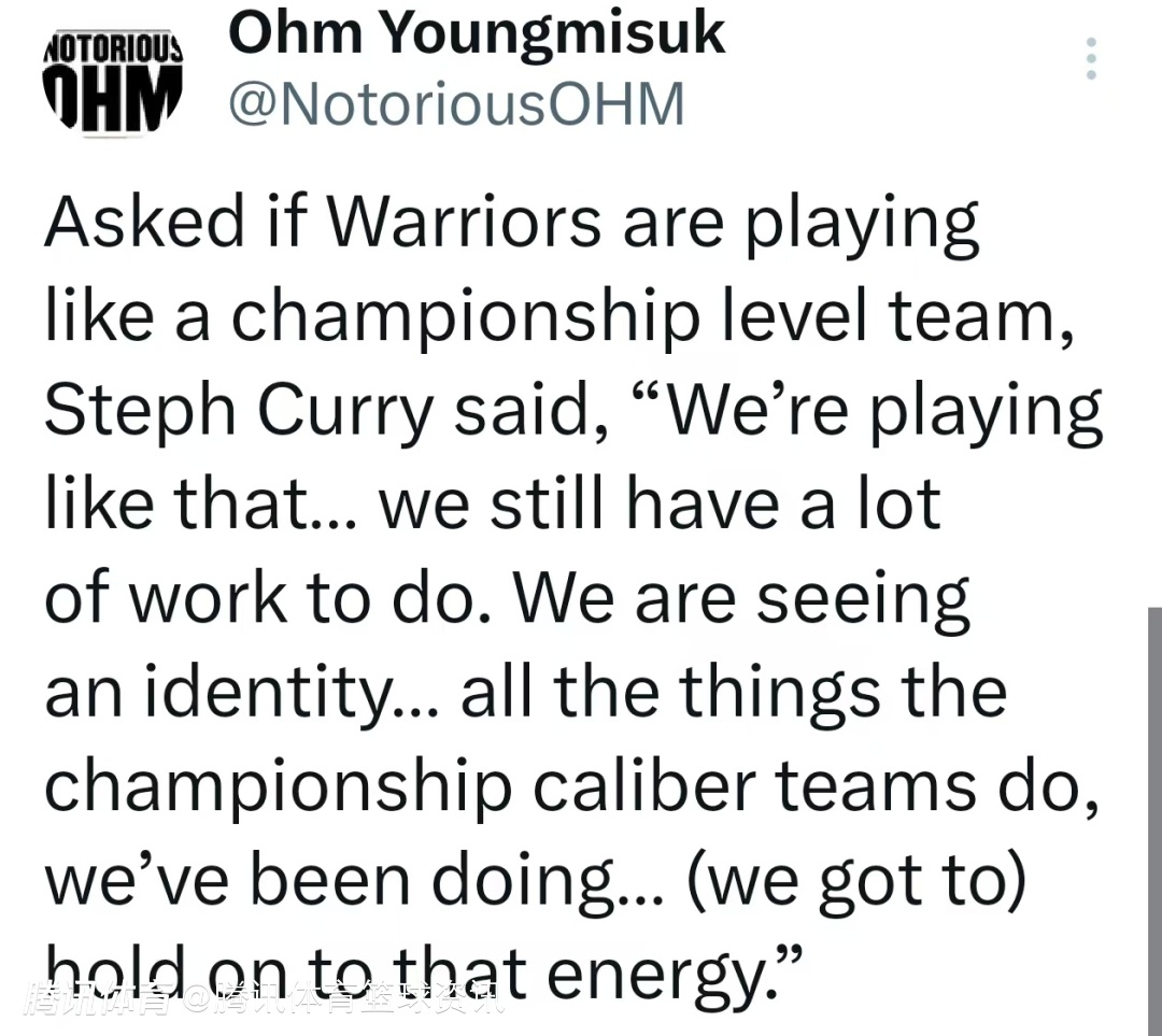 当被问及勇士队是否打出了总冠军级别球队的表现时,库里表示:“我们正打出那样的表现,但我们仍有很多工作要做。我们正在形成一种球队风格,所有总冠军级别球队会做到的事情,我们也一直在做,我们必须保持那种活力。”