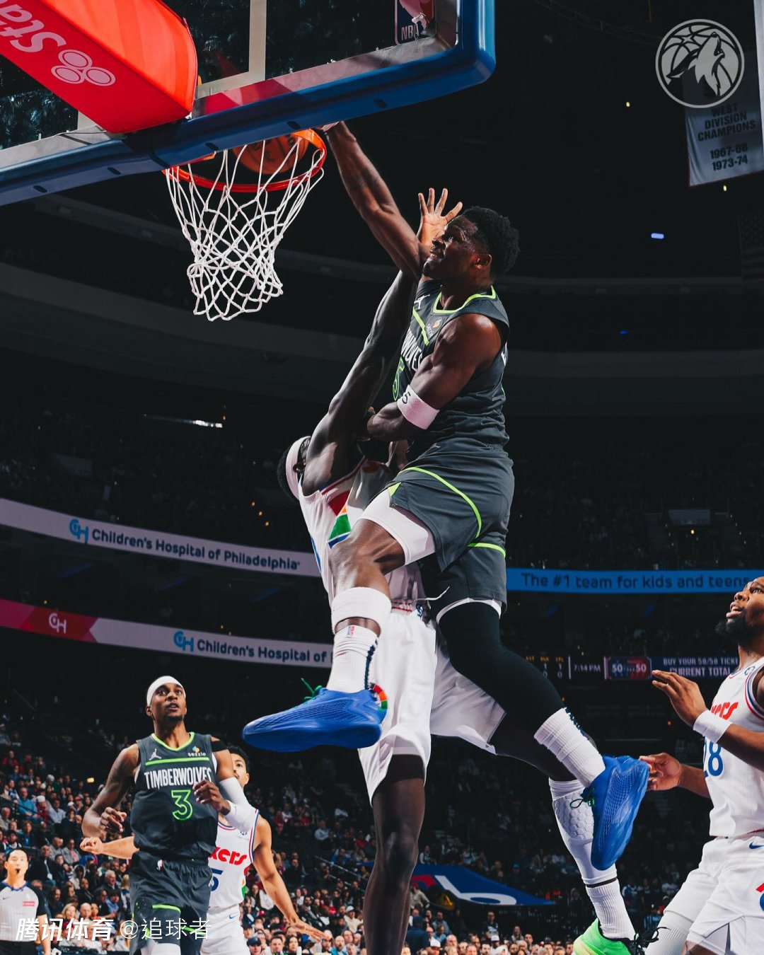 下半场,第三节森林狼28-31被76人追回3分,这一节爱德华兹拿到6分,持球突破杀到内线暴扣,与亚布塞莱对扣的画面令人直呼太爽;不过三节打完森林狼仅仅领先1分。
