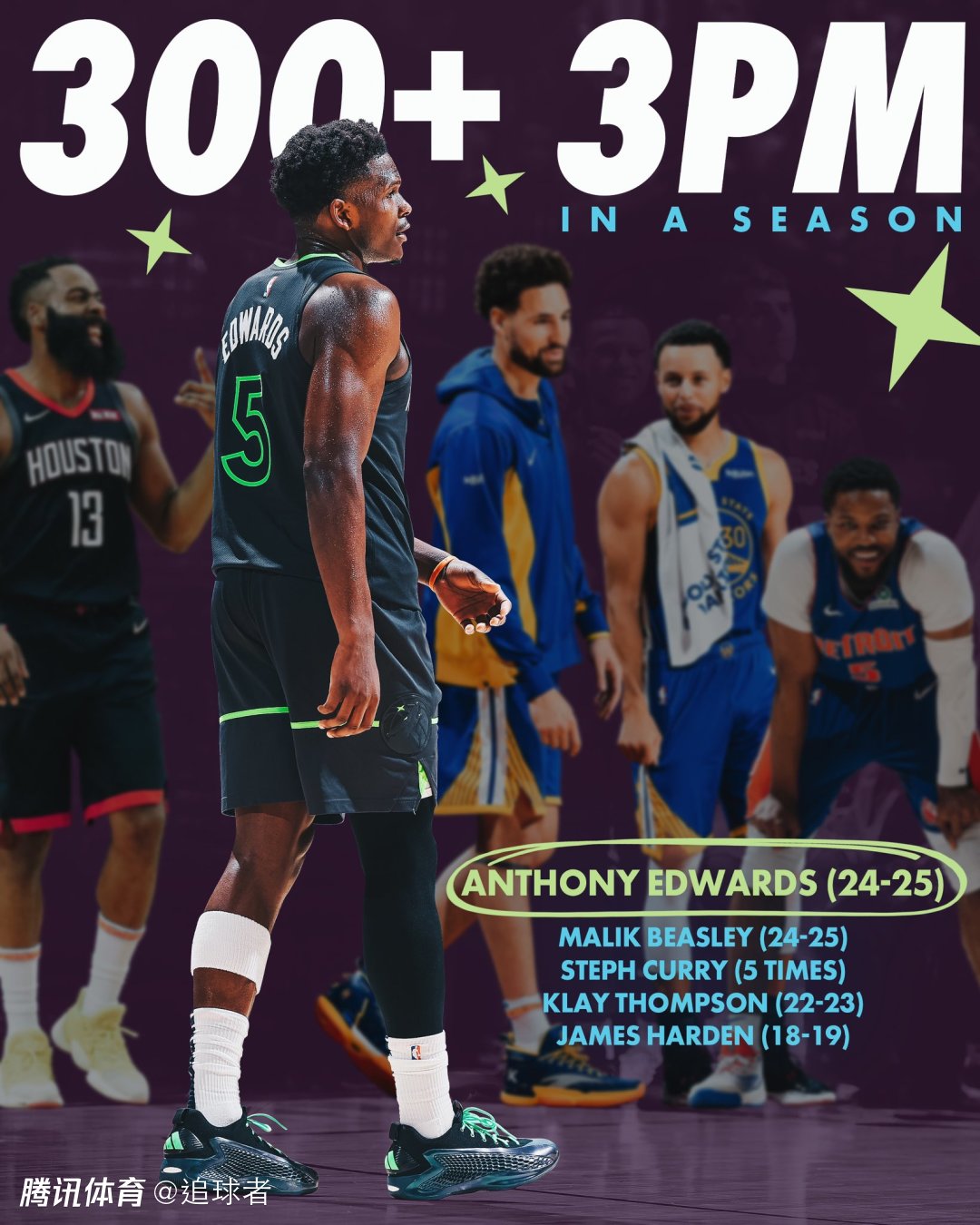 3、爱德华兹成为NBA历史上第五位达成单赛季300+三分球的球员,之前四位是库里、比斯利