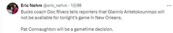 里弗斯:字母哥因伤缺战鹈鹕 康诺顿热身后决定是否出战