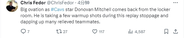 2025-04-07 07:50北京时间4月7日,NBA常规赛继续进行,骑士队对阵国王队。本场比赛进行到第三节结束前9分54秒,骑士队球员多诺万-米切尔左腿意外受伤,返回了更衣室。骑士队记者Chris Fedor透露,米切尔目前已从更衣室回归,并在暂停期间进行了热身,预计可以回归。