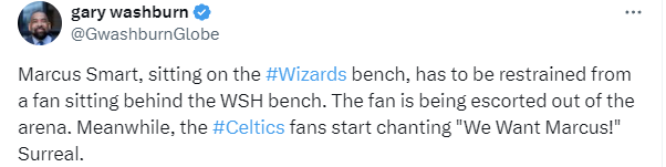 根据现场记者的报道,这位与斯玛特冲突的球迷坐在奇才队替补席后的位置,不知道他与斯玛特说了些什么,但斯玛特情绪很激动,还用手指了这名球迷,奇才队在替补席的球员们也都站了起来。随后这位球迷被安保人员带离了球场。