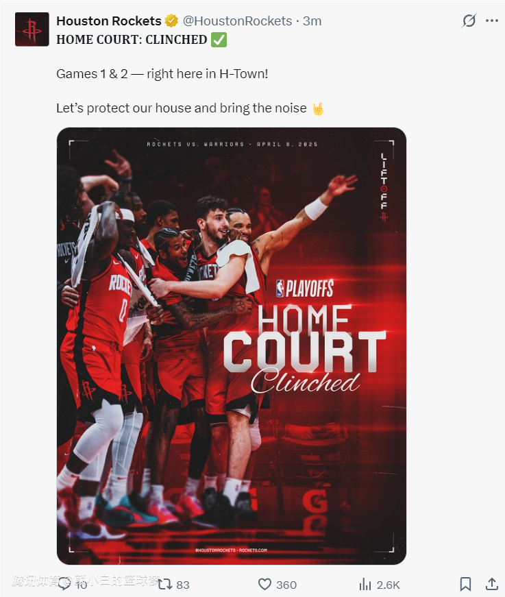 2025-04-07 11:30北京时间4月7日,火箭以106-96击败勇士拿到三连胜,此役后火箭锁定西部前四的席位,火箭官方晒出海报庆祝,这场比赛防守制胜,申京在这场比赛中发挥了极其重要的作用,他制造追梦技术犯规+一级恶意犯规,让勇士最能激励全队的那个人无法挺身而出,火箭官方庆祝已经锁定西部前四手握季后赛主场优势。