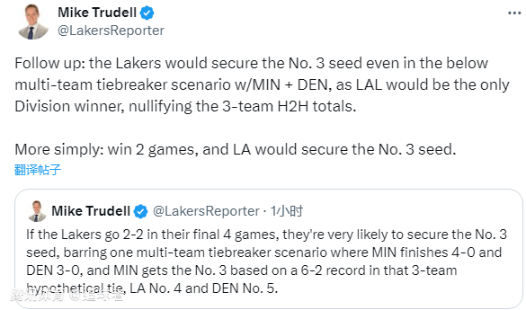 Mike Trudell继续分析:即便在湖人、森林狼和掘金三队战绩并列的情况下,湖人仍能锁定三号种子席位,因为湖人将是分区冠军,这会抵消三队之间的相互交手战绩;更简单地说,最后四场赢两场,湖人就能锁定季后赛西部第三种子席位。