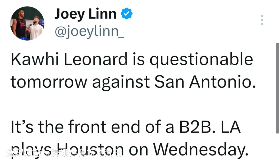 2025-04-08 08:50北京时间4月8日,根据快船队记Joey Linn发布的消息显示,莱昂纳德在明天对阵马刺队的比赛中出战成疑。这将是接下来背靠背比赛的第一场,随后快船队将在周四对阵火箭队。