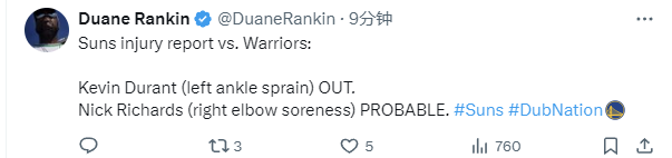 勇士队全员健康,均可出战本场比赛。太阳队杜兰特左脚踝扭伤缺席比赛,理查兹右肘酸痛大概率成疑(75%的可能出战)。