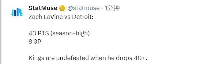 2025-04-08 10:00北京时间4月8日,NBA常规赛继续进行,国王队127-117击败活塞队。国王队球员扎克-拉文此役出战45分钟,28投16中(三分球11投8中)狂轰43分3篮板4助攻1抢断,在场正负值+6。单场43分创造拉文本赛季单场得分新高,在他的带领下,国王队在一度落后18分的情况下完成翻盘,豪取3连胜。而本赛季,当拉文砍下40+时,国王队保持不败。