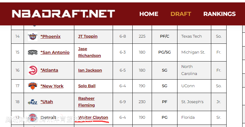 在知名选秀网站NBA Draft上,小沃尔特-克莱顿的最新预测顺位是首轮第19位,选秀模板是佩恩和泰勒-约翰逊,并对其优势评价如下: