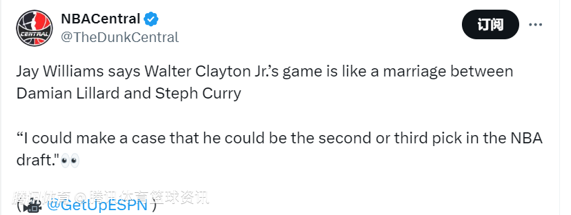 赛后,知名篮球评论员杰-威廉姆斯表示,小沃尔特-克莱顿的球风就像是利拉德和库里的结合体,他说道:“我有理由认为,他有可能在NBA选秀中成为榜眼或探花。”