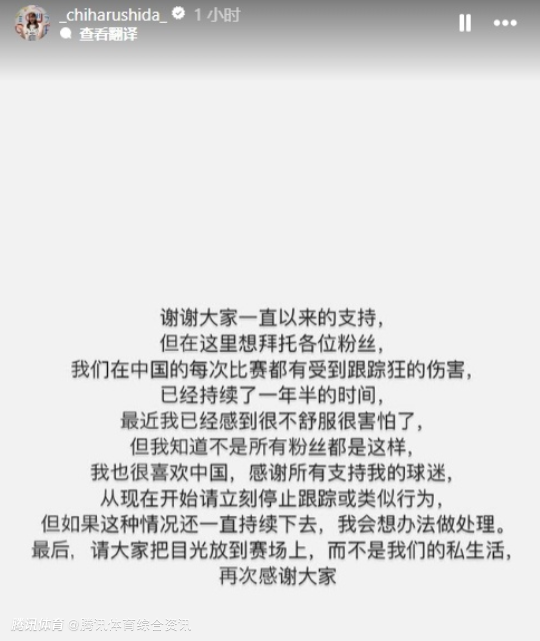 谢谢大家一直以来的支持,但在这里想拜托各位粉丝,我们在中国的每次比赛都有受到跟踪狂的伤害,已经持续了一年半的时间,最近我已经感到很不舒服很害怕了,但我知道不是所有粉丝都是这样,我也很喜欢中国,感谢所有支持我的球迷,从现在开始请立刻停止跟踪或类似行为,但如果这种情况还一直持续下去,我会想办法做处理。最后,请大家把目光放到赛场上,而不是我们的私生活,再次感谢大家!