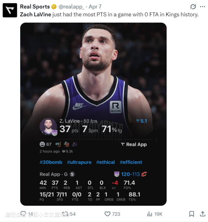 这场比赛后拉文一战创造多项纪录:1.43分创造赛季新高,国王生涯新高;