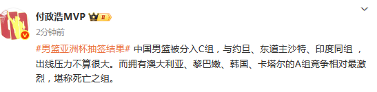 媒体人“孔德昕”发文点评说道:“男篮亚洲杯小组抽签出炉,中国男篮、约旦、沙特、印度在一组,足球的仇篮球来报是吧”。