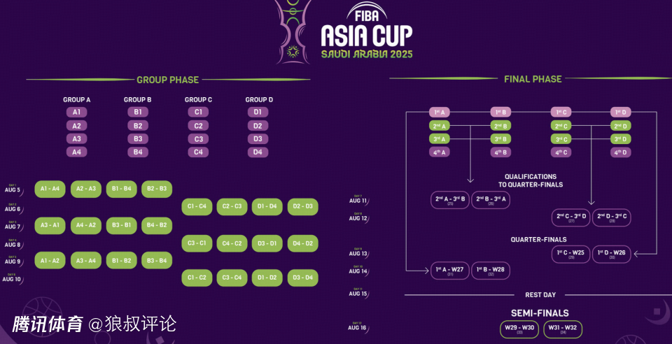 本届亚洲杯将于8月5日-8月17日在沙特阿拉伯吉达举行,16支参赛球队分为4个小组,小组头名球队直接晋级八强,获得小组二、三名的球队则需要进行一场交叉淘汰赛,取胜的一方入围四分之一决赛。