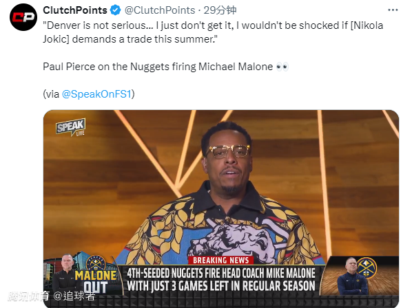 对于掘金清洗管理层一事,NBA名宿保罗-皮尔斯在节目中说道:丹佛掘金不是在开玩笑吧。自他们夺冠后,他们就续约了很多夺冠的核心成员。掘金在季后赛开始前解雇主教练,这是在表明,本赛季他们没有最佳夺冠机会,他们在浪费这一代最佳球员的巅峰期。我就是理解不了他们的做法。如果约基奇今夏申请交易,我不会感到震惊。