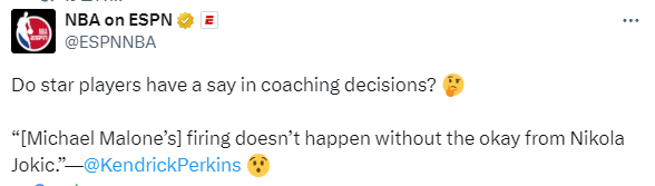 帕金斯还表示:没有约基奇的同意,马龙是不会被掘金解雇的。
