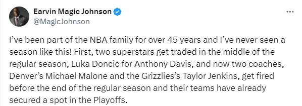 湖人名宿魔术师约翰逊更推道:“我已经是NBA大家庭的一员超过45年了,但我从未见过这样的赛季!首先,在常规赛期间竟然有两位超级巨星被交易——卢卡-东契奇换安东尼-戴维斯。而现在,丹佛掘金的迈克尔-马龙和孟菲斯灰熊的泰勒-詹金斯在常规赛结束前就被解雇,而他们的球队已经锁定了季后赛席位。