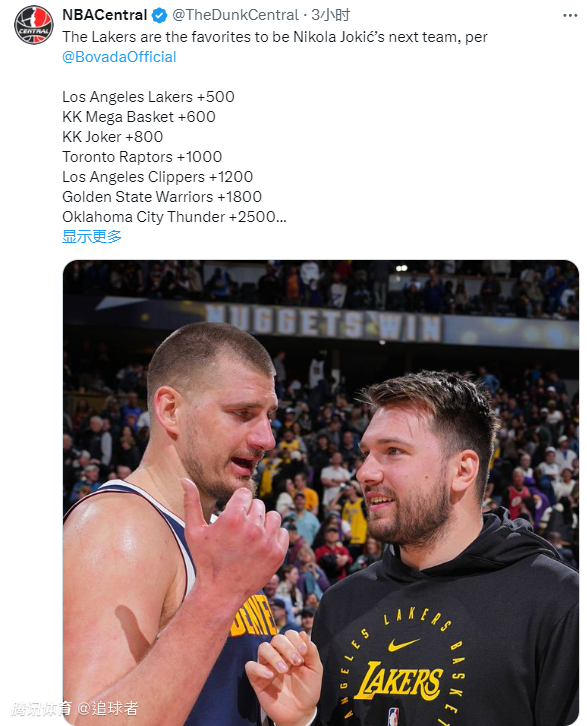 掘金解雇主帅之后,美媒开出约基奇下家赔率,湖人成为约基奇的头号热门下家,猛龙、快船、勇士和雷霆等队在列;若约基奇今夏申请离队,联盟将有多支球队追求他。