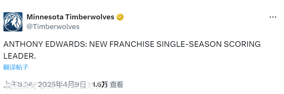 在队史单赛季得分王榜单中,爱德华兹还以2023-24赛季的2049分排名第3,乐福在2003-04赛季取得的2010分和加内特在2003-04赛季取得的1987分排名第4和第5位。