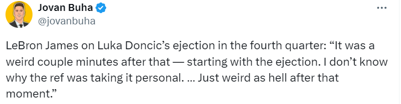 詹姆斯说道:“是的,在那之后的几分钟里,情况真的非常奇怪。从东契奇被驱逐这件事开始说起吧,我不知道为什么裁判会把这事当成是针对他个人的。他之前已经给了卢卡一次(技术犯规),卢卡也清楚这一点。当时卢卡正和坐在场边的球迷争论,就像他平常会做的那样。球迷可以喷垃圾话、出言不逊,不管他们说了什么,卢卡也回了几句,然后裁判就觉得这是在针对他。后来,范德比尔特封盖后又吃了一个技术犯规,从那之后,情况就变得极其诡异。”