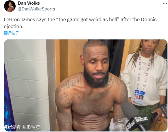 谈到东契奇被驱逐,詹姆斯表示:驱逐之后的几分钟,比赛变得很奇怪,我不知道裁判为什么针对卢卡,他已经给了卢卡一个技术犯规,卢卡也知道这一点;卢卡当时只是在和场边的球迷交流,球迷只是在胡言乱语,卢卡做出回应,裁判认为他是在和自己作对。之后他又给范德比尔特一个技术犯规,从那个时刻开始,比赛就变得极其诡异。